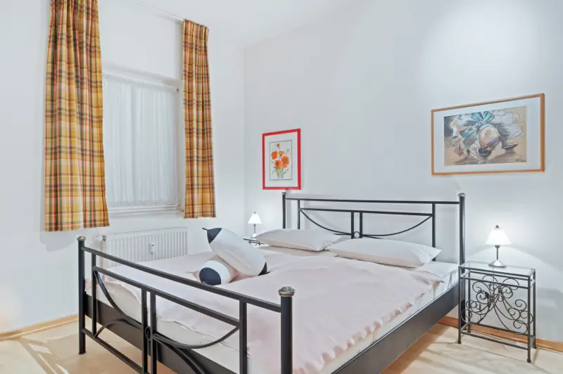 Die Ferienwohnung befindet sich im Erdgeschoss und bietet mit 77 qm Platz für bis zu 6 Personen. Durch einen offenen Flur mit Garderobe gelangen Sie in das gemütliche Wohnzimmer mit Küchenzeile. Freuen Sie sich auf erholsame Stunden im großzügig eingerichteten Wohnbereich. Eine bequeme Sofa-Garnitur, die sich bei Bedarf in einen zusätzlichen Schlafplatz verwandeln lässt, sorgt für angenehme Abende. Große Fenster sorgen für viel Tageslicht, und durch eine Glastür gelangen Sie auf die sonnige Terrasse mit Blick in den Park. Hier können Sie den ganzen Tag die Sonne genießen und in der grünen Umgebung entspannen. In der angrenzenden, voll ausgestatteten Küchenzeile lassen sich Ihre Lieblingsgerichte einfach zubereiten. Der Esstisch bietet ausreichend Platz für gemeinsame Mahlzeiten oder gesellige Spieleabende. Für erholsamen Schlaf stehen Ihnen drei Schlafzimmer zur Verfügung: Zwei Schlafzimmer sind mit komfortablen Doppelbetten und geräumigen Kleiderschränken ausgestattet. In dem dritten Schlafzimmer bietet ein Hochbett zwei weitere Schlafplätze. Das Badezimmer verfügt über eine geräumige Dusche, ein WC, einen Handtuchheizkörper und einen Waschtisch mit ausreichend Stauraum für Ihre Badutensilien.